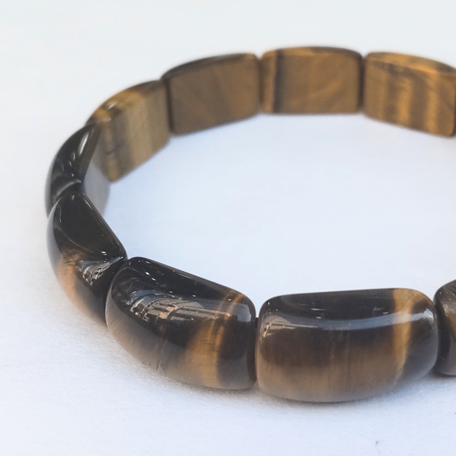 美しく研磨されたタイガーアイの表面には「シャトヤンシー」または「キャッツアイ効果」と呼ばれる光の帯が見られます。