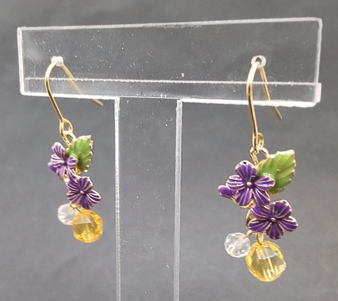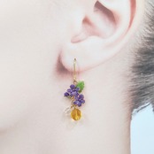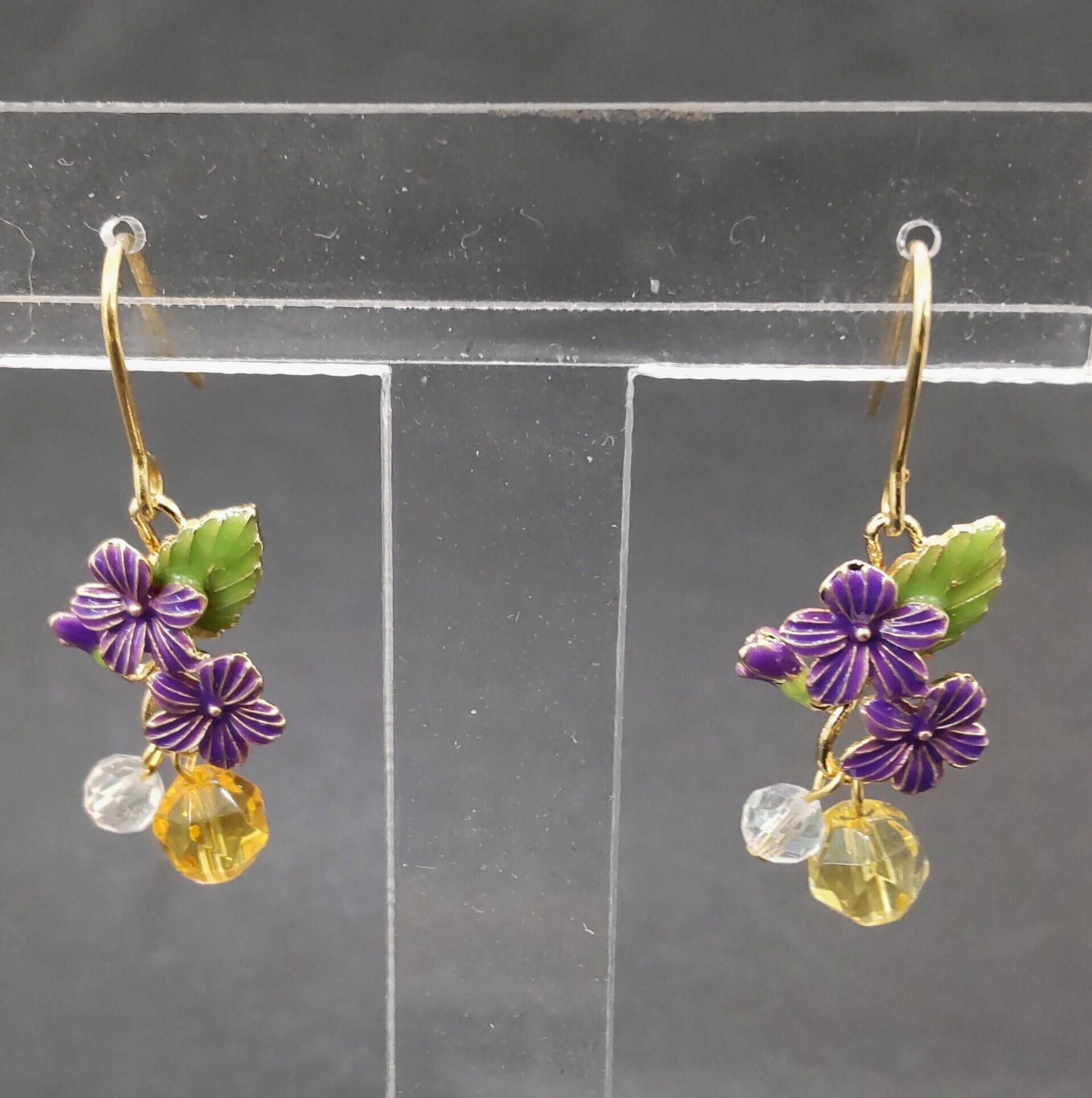 可憐なスミレモチーフにあわせてカットを施したシトリンと水晶を組み合わせたピアス。